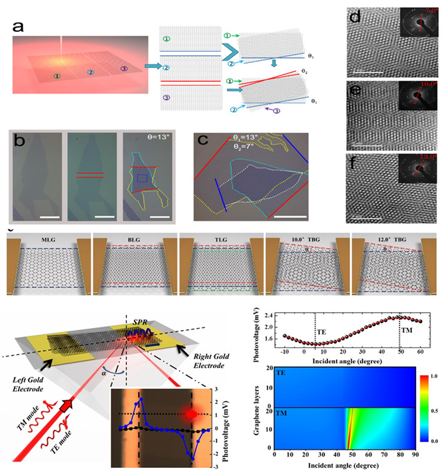 刘智波教授和田建国教授课题组近年来一直致力于二维材料层间转角的控制和相应结构的光电性质的探索和研究。发展了一种对机械剥离石墨烯进行选择性转移和定点转移的新技术,该技术能够将图形化加工的目标石墨烯单独转移到任意位置,而将目标石墨烯周围杂乱无章的石墨碎片留在原基底2。在此技术基础上,进一步发展了一种能够对旋转角度进行精确控制的转角多层石墨烯制备技术,这是第一种具有角度控制能力的制备方法,研究了转角双层石墨烯的光电响应增强。在实验上第一次制备出了具有特定旋转角度的双转角三层石墨烯,第一次在实验上研究了双转角三层石墨烯的拉曼光谱,证明了双转角三层石墨烯可以视为两个具有相应旋转角度的转角双层石墨烯的叠加。该成果同样发表在Advanced Materials上3。利用表面等离子共振原理、范霍夫光吸收增强效应以及全反射效应等,研究了转角堆叠石墨烯的光学吸收增强和光电响应增强,其成果发表在国际知名期刊Advanced Optical Materials上4。
