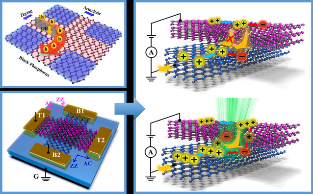 黑磷由于其独特的正交晶体结构,具有可调的直接带隙、高的载流子迁移率、以及强的平面内各向异性光电子性质。该团队基于黑磷各向异性的能带结构,利用载流子输运过程中在不同晶向之间的转变设计了新型的取向二极管。观察到了类似于传统半导体pn结的电学整流现象以及反常的门控区域性光电增强现象。结合第一性原理以及传统半导体异质结的光电理论,提出了“晶向导向”的能带理论。这类基于二维材料各向异性所实现的新型取向二极管,对二维材料的基本物理性质研究和新型光电器件的设计都提供了新的思路。该成果最近发表在国际知名期刊Advanced Materials上1。