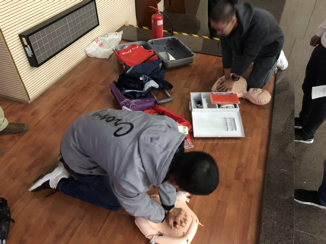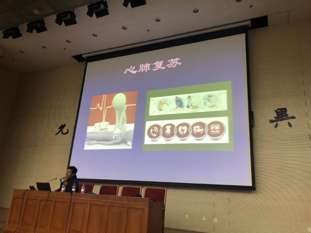 崔建林老师通过理论讲解与现场互动的方式,向大家普及心肺复苏、创伤包扎、中毒及异物入眼的处理等紧急救护常识。尽管物理学院的师生们没有专业的医学背景,但仍能通过崔老师通俗易懂的讲解,掌握每个救护过程的关键步骤及其背后的医学原理。理论讲解过后,师生们还积极参与互动,通过教学模型来进行心肺复苏、创伤包扎的练习。