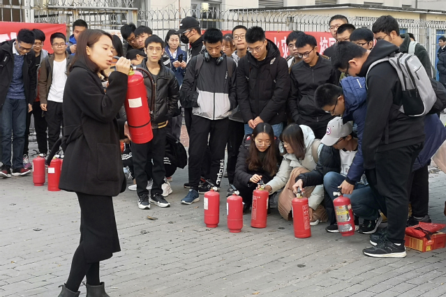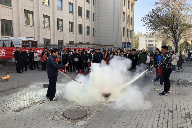 培训结束,应急疏散逃生演练正式开始,模拟第三教学楼突发火情。伴随火灾警报声响起,师生在工作人员的指引和协助下,从紧急出口紧张有序地撤离到安全地带。疏散逃生演练完毕,保卫处李娜老师又现场示范了灭火器的使用方法,指导师生积极参与实际操作体验。