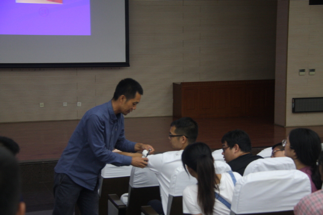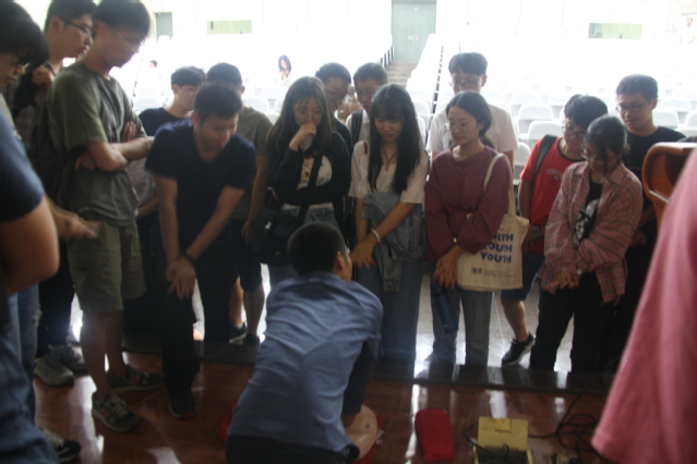 崔建林老师将理论与实践相结合,深入浅出的为同学们普及心肺复苏、创伤包扎、中毒及异物入眼的处理等紧急救护常识。讲解过程中现场互动频繁,通过各种道具、模型、急救包的展示,为同学们带来了直观感受。讲座结束后,部分同学自发在崔老师的指导下进行了实操练习。