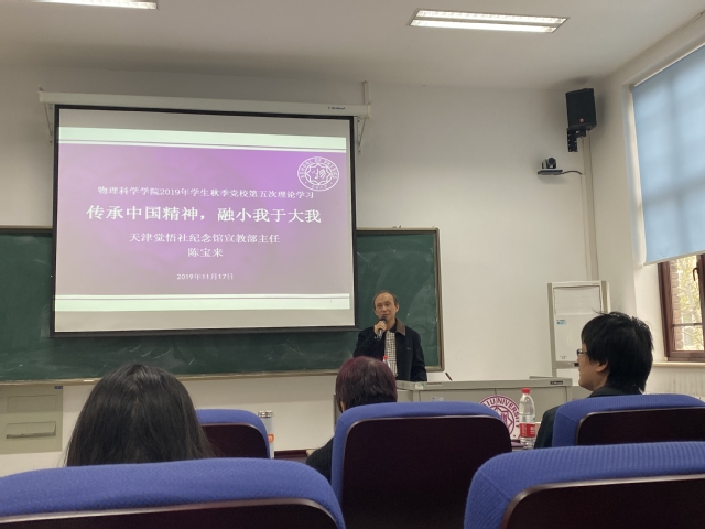 (通讯员 姜朋佐 吴宵宵)11月17日下午,天津觉悟社纪念馆宣教部主任陈宝来来到南开大学物理科学学院,围绕“觉悟”精神和“初心”,为师生讲述了一堂题为“传承中国精神,融小我于大我”的生动党课。物理科学学院党委书记史永红,党委副书记、副院长张学良,学院党校学生到场参加。