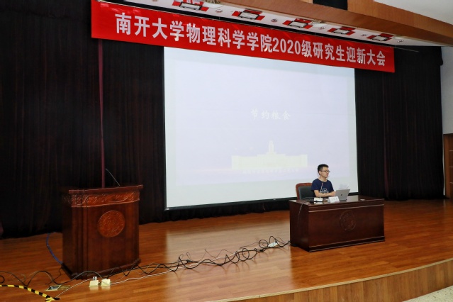 (通讯员:李凡一 吴清范)为了落实习近平总书记关于“坚决制止餐饮浪费行为,切实培养节约习惯”的重要指示,鼓励青年学生们继承优良革命传统,发扬艰苦奋斗精神,培养勤俭节约,使用清洁能源的良好生活习惯。物理科学学院于9月21日研究生迎新大会上开展“节约粮食”,“绿色节能”研究生主题教育活动,南开大学后勤保障部和南开大学物理科学学院硕士第二党支部面向2020级研究生新生主讲开学第一课。
