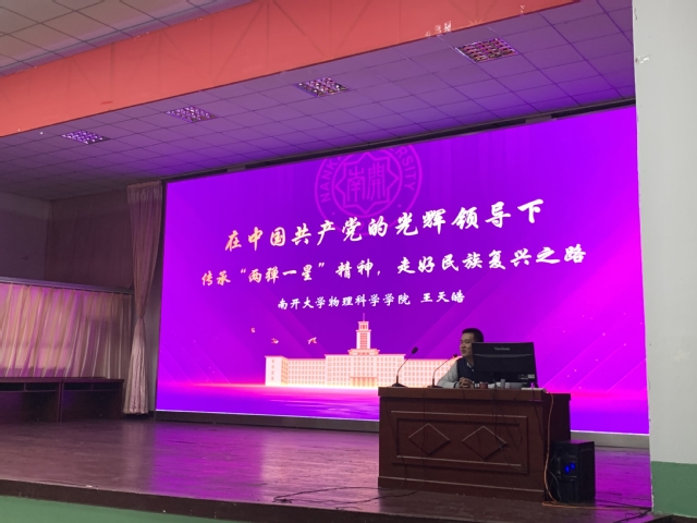 据悉,为扎实推动党史学习教育,物理科学学院积极组织学生骨干开展理论宣讲工作,以学生永怀精神宣讲团为载体,依托“全国党建工作样板支部”硕士第二党支部形成党建引领班团建设的传帮带机制,围绕传承发扬“两弹一星”精神培育形成了一系列“宣讲+话剧展演”式特色党课、团课。受天津市各区教育局等单位邀请,该项目团队20余名同学已先后走进武清区天和城实验中学、宁河区芦台一中、宝坻区宝坻一中等学校进行党史学习教育专场展演,有效形成广泛辐射,推动党史学习教育和爱国主义精神入脑入心,相关活动得到人民网、天津新闻、今晚报、中国青年网等媒体关注报道,引起良好社会反响。