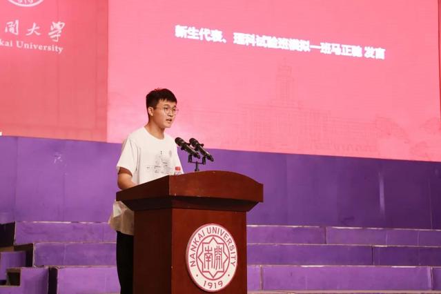 新生代表、理科试验班(数理科学与大数据)模拟一班本科生马正驰讲述了南开校史对自己理想信念的影响,表示愿肩负历史使命、参与科研实践、努力成长成才。