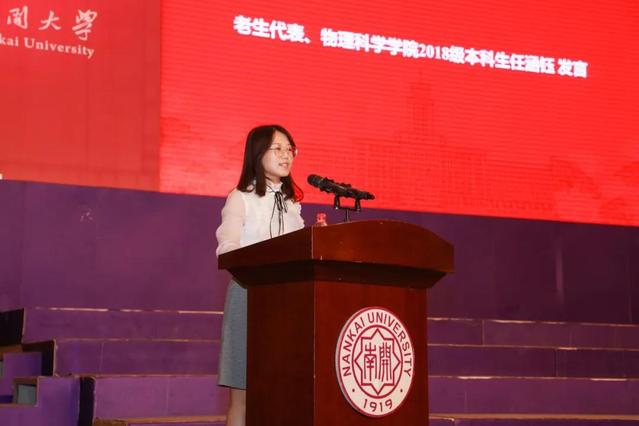 老生代表、物理科学学院2018级本科生任涵钰分享了她在南开的学习生活,鼓励同学们勇敢逐梦、脚踏实地、智勇真纯。