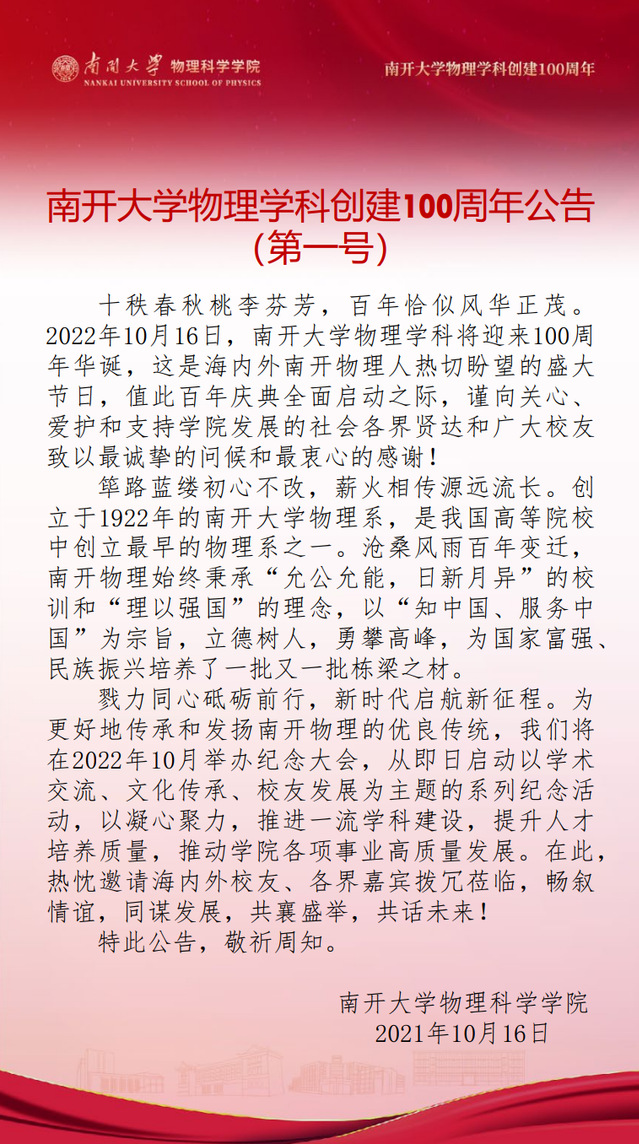 【创建100周年公告】南开大学物理学科创建100周年公告(第一号)