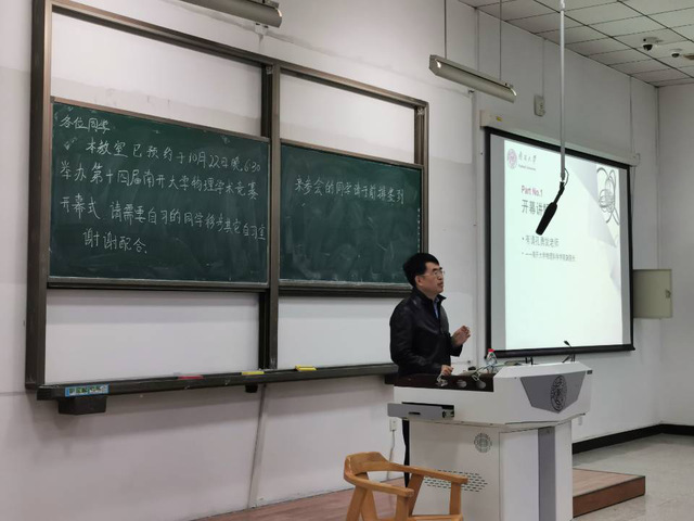 会议开始,物理科学学院副院长孔勇发致辞。他希望同学们能够充分利用自己的课余时间,在学术竞赛备赛阶段与比赛阶段全方面锻炼和提升自己,希望同学们勇敢参与,跟上节奏,定能有所收获。他也期望在NKPT结束后能够有更多的同学积极参与CUPT集训队,挑战极限,在更广阔的赛场上为荣耀而战。