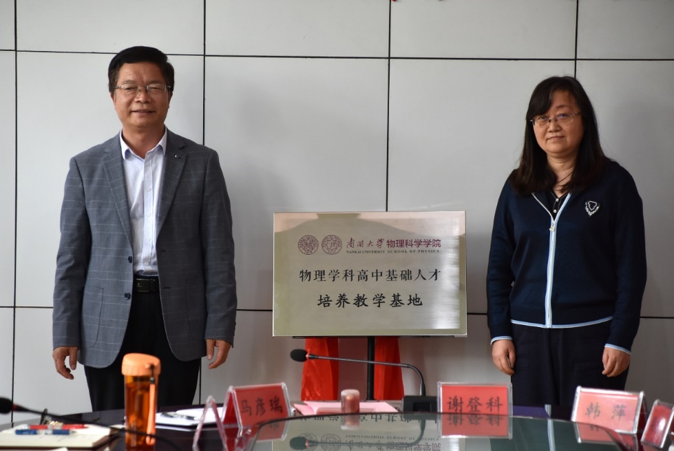 江苏省清河中学党委书记校长颜廷发、副校长于秀权共同为南开大学物理科学学院共建物理学科高中基础人才培养教学基地进行揭牌