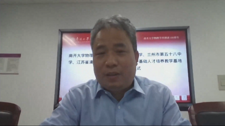 2022年5月19日,南开大学物理科学学院与沧州市第一中学、兰州市第五十八中学和江苏省清河中学举行了物理学科高中基础人才培养教学基地云签约仪式,南开大学物理科学学院院长张国权、沧州市第一中学党委书记校长于秀娥、兰州市第五十八中学校长谢登科、江苏省清河中学党委书记校长颜廷发,物理学科高中基础人才培养与教学实践计划执行委员会(以下简称执委会)主任吴雨浓出席会议并致辞,各单位相关领导、教师代表共同参与了签约及揭牌仪式。