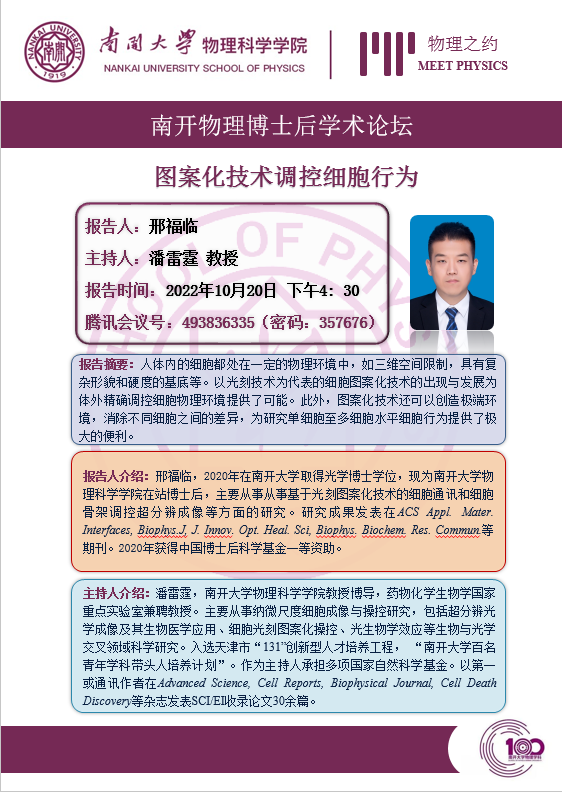【“物理之约”博士后学术论坛】(第 3 期)图案化技术调控细胞行为