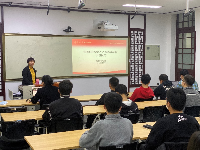 为深入学习领悟党的二十大精神,用党的科学理论武装青年,用党的初心使命感召青年,11月3日,物理科学学院举办2022年秋季党校开班仪式暨第一次集中学习。物理科学学院党委书记史永红、党委副书记韩榕、党委专职组织员夏焕云、团委书记李凡一出席,本硕博入党积极分子28人参加了开班仪式。