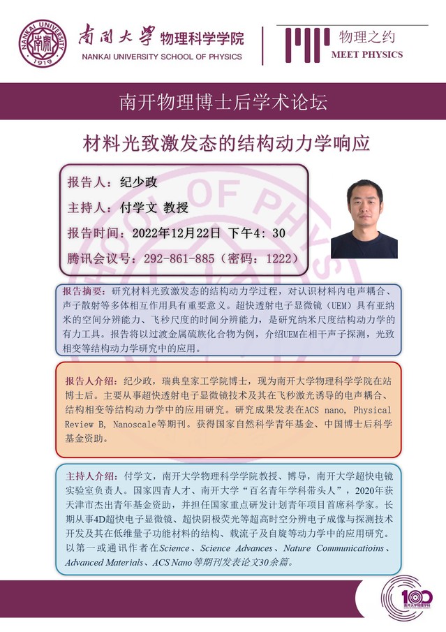 【“物理之约”博士后学术论坛(第 4期)】材料光致激发态的结构动力学响应