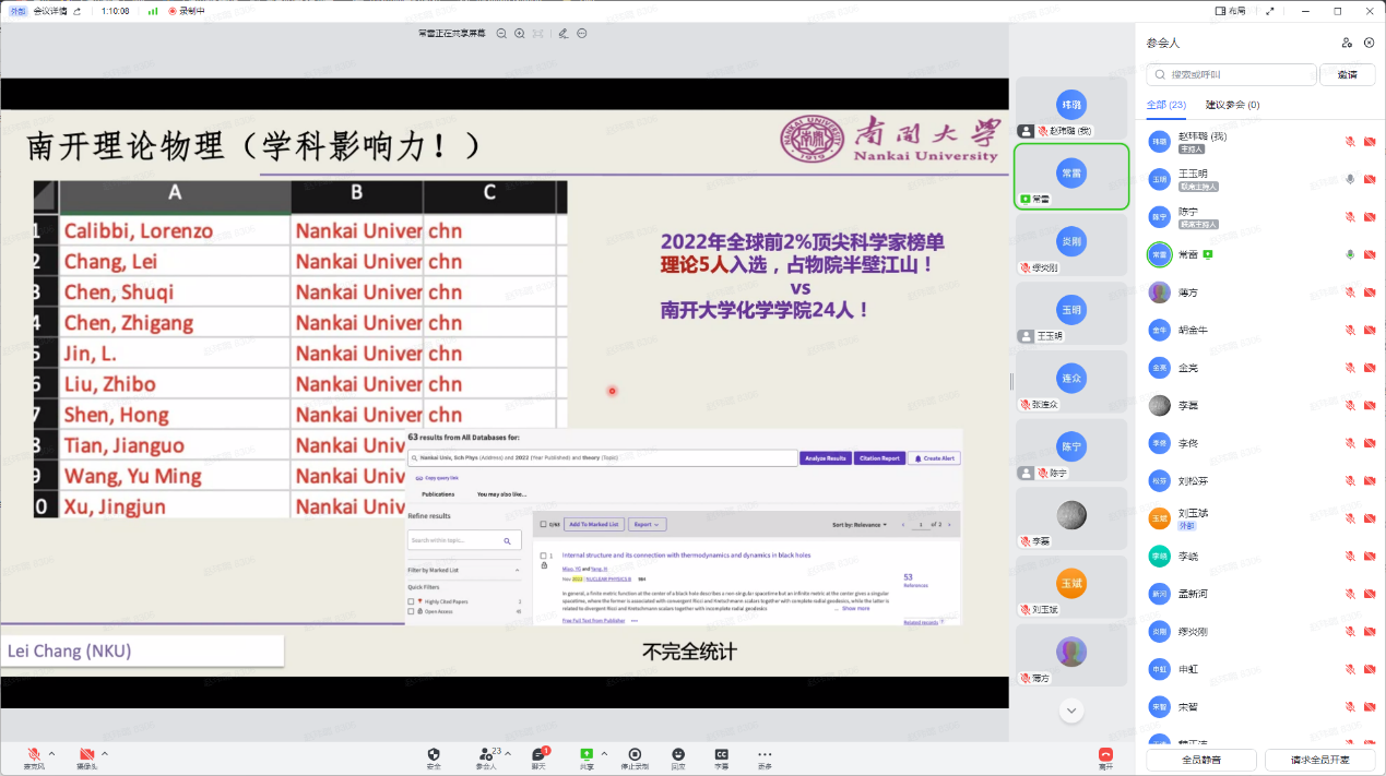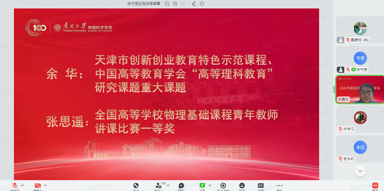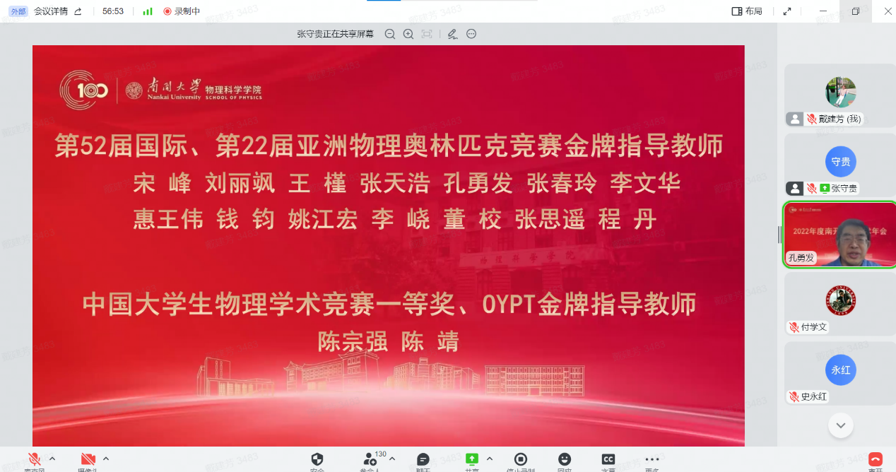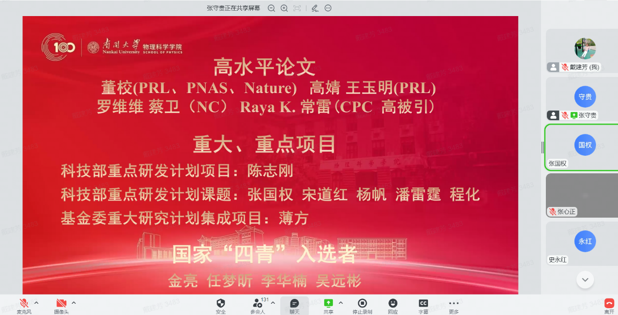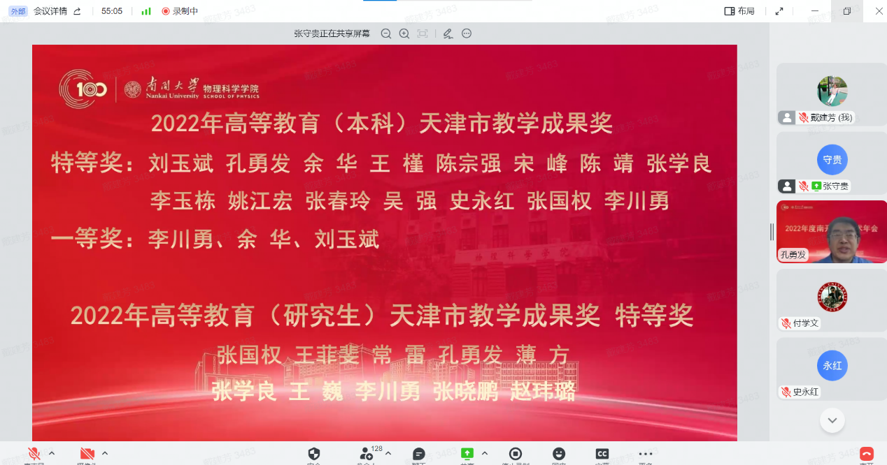 12月30日,物理科学学院全院教师大会暨2022年南开物理学术年会成功举办,全院教师齐聚云端,总结经验,表彰先进,谋划未来,凝聚共识,物理科学学院和泰达应用物理研究院全体教师和博士后130余人参加,学院党委书记史永红主持开幕式。