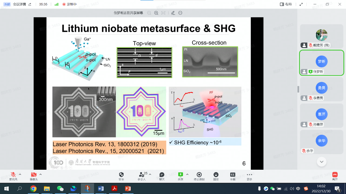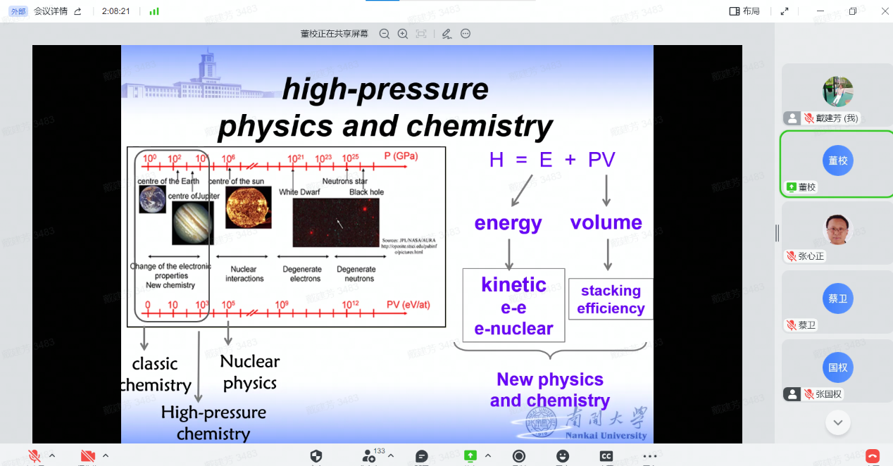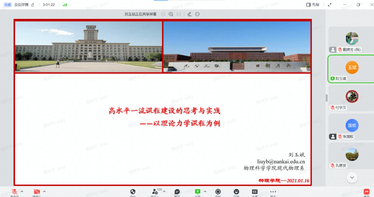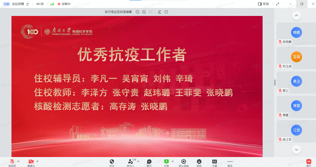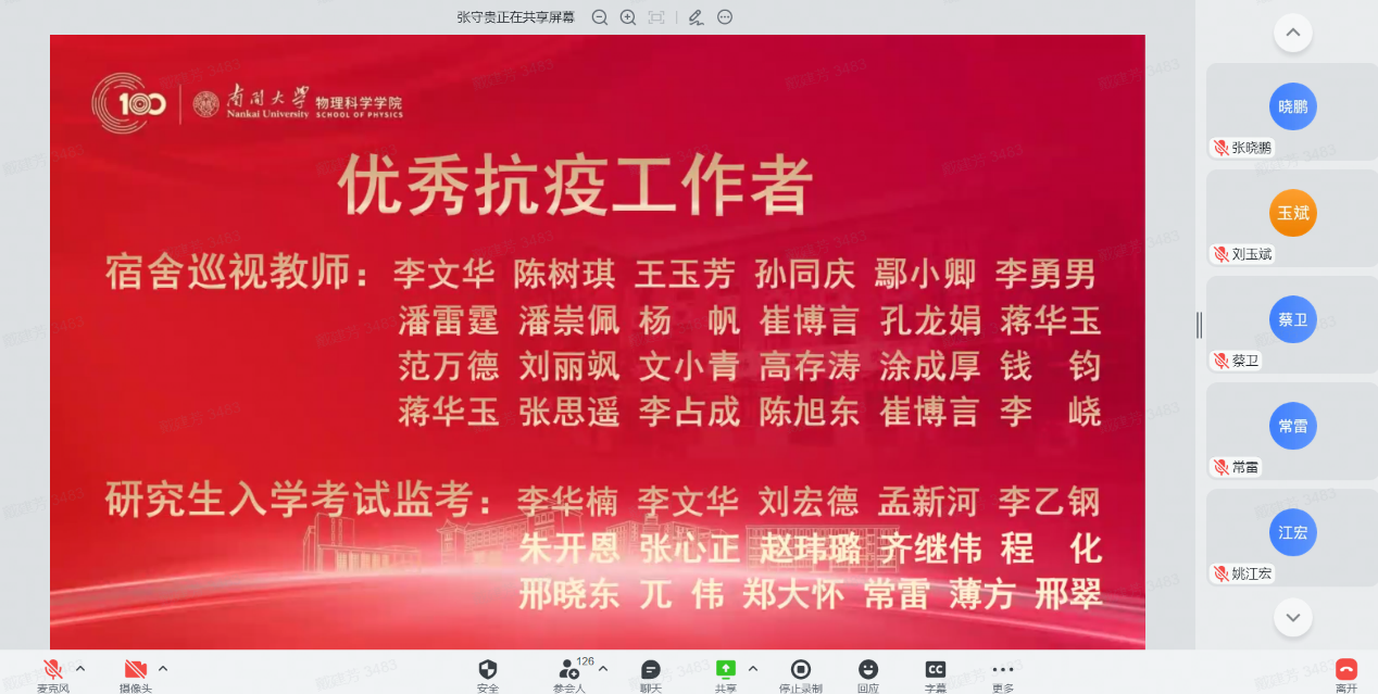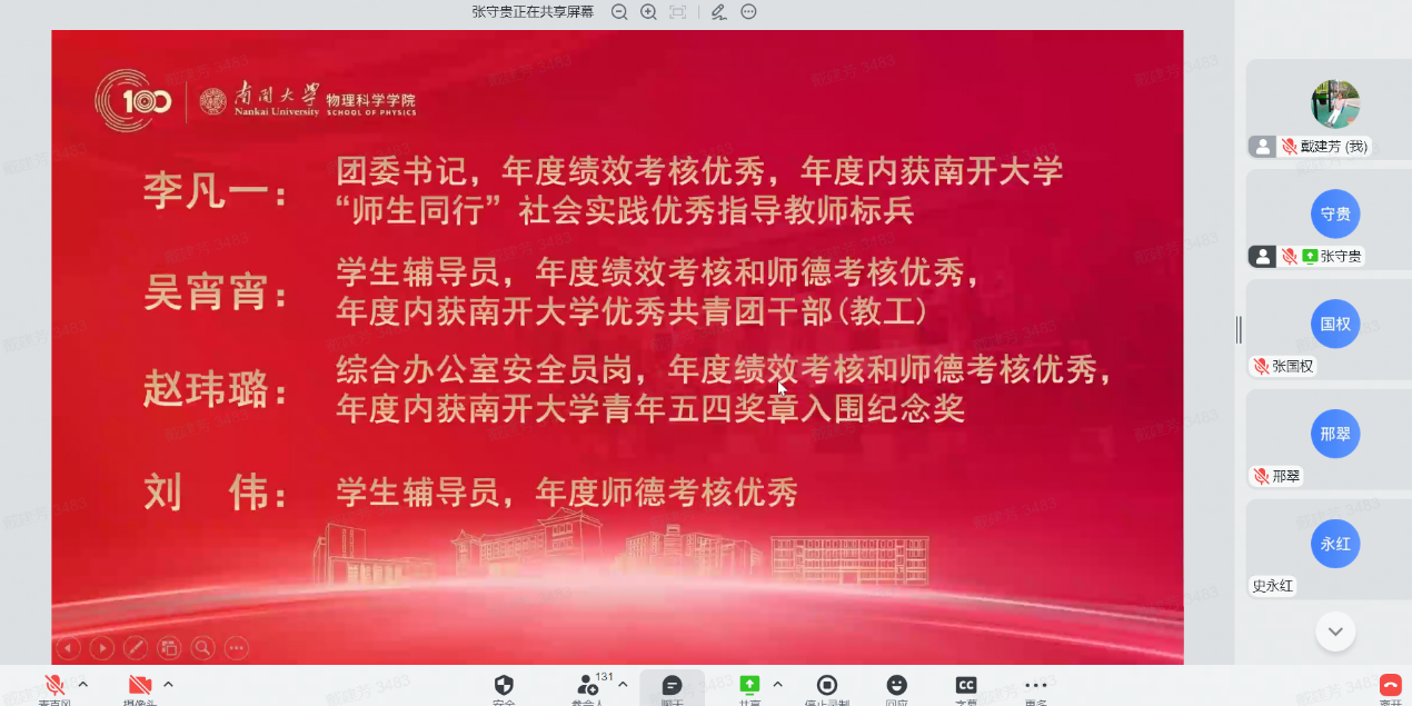 12月30日,物理科学学院全院教师大会暨2022年南开物理学术年会成功举办,全院教师齐聚云端,总结经验,表彰先进,谋划未来,凝聚共识,物理科学学院和泰达应用物理研究院全体教师和博士后130余人参加,学院党委书记史永红主持开幕式。
