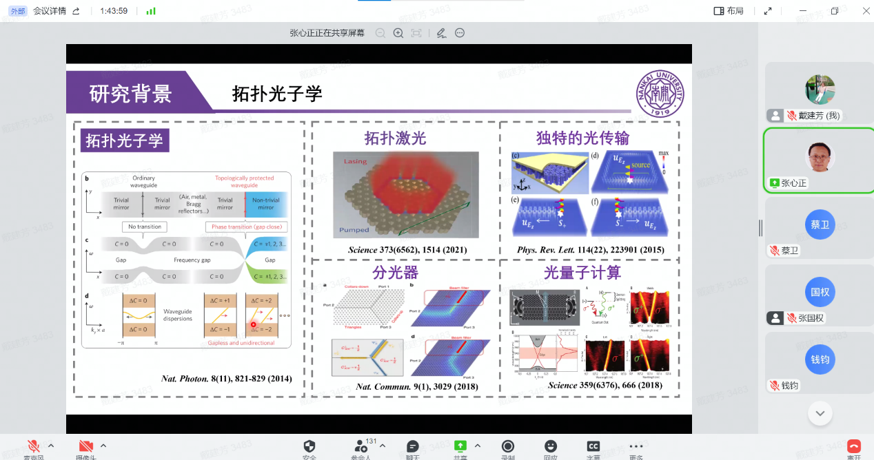会议下午阶段进行了光学、理论、凝聚态物理、实验中心、博士后五个分会场报告,90余位教师就“课程思政”实践、学科前沿热点和创新性工作进行汇报展示,报告图文并茂,深入浅出,学科交叉,思维碰撞,激发灵感,满满一天的学术盛宴,让参与的师生受益匪浅,深受启发,为下一阶段工作开阔了思路。