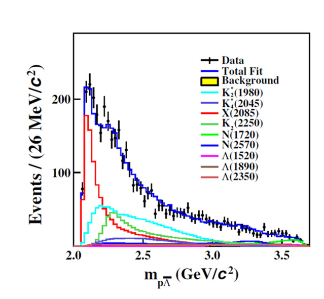 衰变得到的pΛ ̅不变质量谱的振幅分析拟合结果,可以看到明显的pΛ ̅近阈增强结构X(2085)。