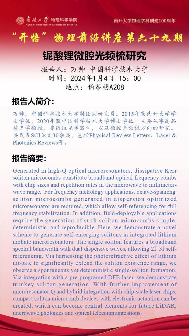 【“开悟”物理前沿讲座(第69期)】铌酸锂微腔光频梳研究