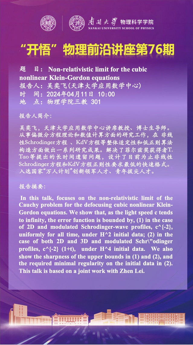 【“开悟”物理前沿讲座 (第76期)】Non-relativistic limit for the cubic nonlinear Klein-Gordon equations