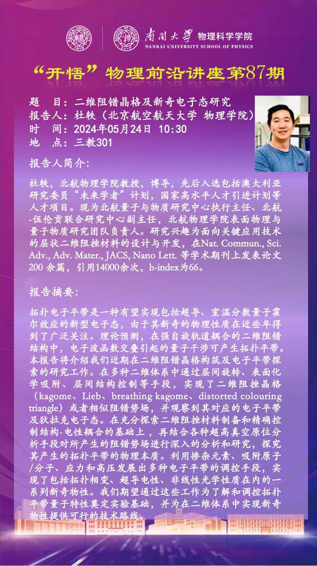 【“开悟”物理前沿讲座 (第87期)】二位阻错晶格及新奇电子态研究