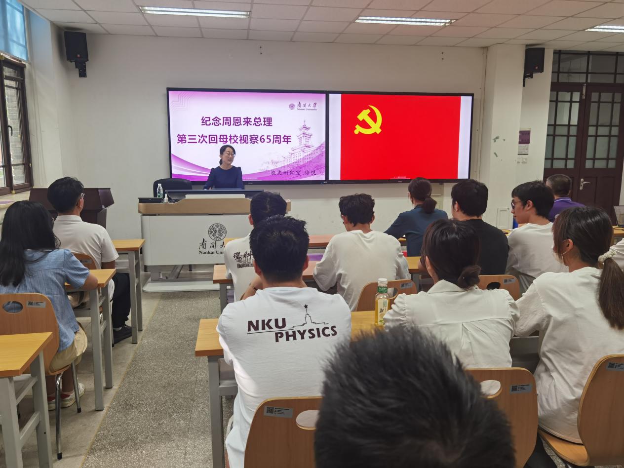 为弘扬伟大建党精神,引导学院师生自信自强、守正创新,踔厉奋发、勇毅前行,在中国共产党迎来103岁生日之际,物理科学学院举办纪念周恩来总理第三次视察南开大学65周年暨物理科学学院“七一”建党节活动。学院党委书记唐柏权出席活动,学院新发展党员、积极分子共同参加,活动由学院党委副书记、副院长韩榕主持。