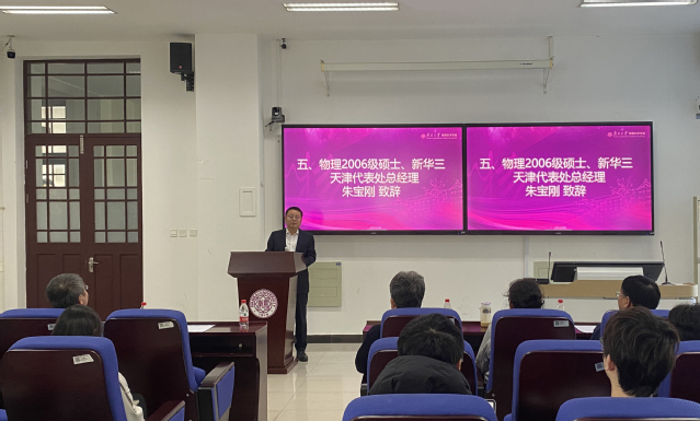 朱宝刚校友毕业后从事数字化和智能化产业的开发和推广,现任新华三集团天津代表处总经理,情系物理,回馈母校,于2024年初向学院捐赠四台教学设备,升级三教105教室和301报告厅的多媒体设施,建设智慧教室,提升了学院智能化教学环境。他在致辞中向一直以来辛勤耕耘、无私奉献的老师们致以最崇高的敬意,向朝气蓬勃、努力学习的学弟学妹们表达最真挚的祝福。他说,母校是学生成长的摇篮,也是梦想起航的地方,多媒体教学设备的捐赠,希望能够帮助更多的学弟学妹们实现他们的梦想,也期待母校有更美好的未来。