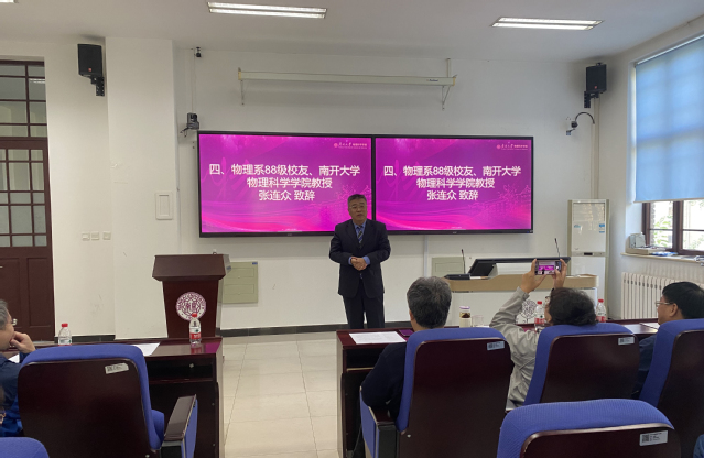 张连众教授代表物理系1988级校友致辞,回顾了在母校求学与从教的三十多年美好时光,表达了作为一名老南开人对母校的赤诚和挚爱。他表示,富含文化精髓的“允公允能、日新月异”校训早已内化为人生价值追求和精神丰碑,多年来立足教师岗位,坚守教育初心,潜心教书育人,致广大而尽精微,努力做学生为学为事为人的好老师。现场吟诗一首向母校表达校友们最深切的感情。