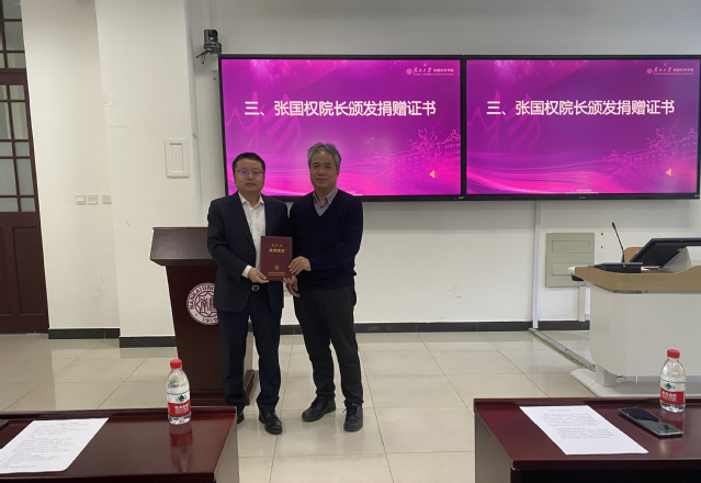 仪式上,张国权院长对校友们的来访和慷慨义举表示热烈的欢迎和真诚的感谢,分别介绍了物理系1988级校友捐款、新华三朱宝刚校友捐赠智慧教室的基本情况,并向校友们颁发捐赠证书。
