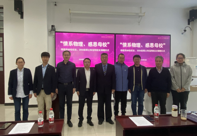 金秋十月,伴随着南开大学建校105周年校庆活动的喜庆氛围,23日,“情系物理、感恩母校”物理科学学院校友捐赠仪式在三教报告厅举行。物理系1988级本科、南开大学物理科学学院教授张连众,物理系1988级本科、1992级硕士、金融投资公司徐荣伟,物理系1988级本科、物流公司总经理王永胜,2006级硕士、新华三集团天津代表处总经理朱宝刚,新华三集团天津代表处教育医疗行业部长杜海阳,学院党委书记唐柏权,院长张国权,副书记韩榕,副院长邢翠,教师和学生代表出席捐赠仪式。活动由邢翠主持。