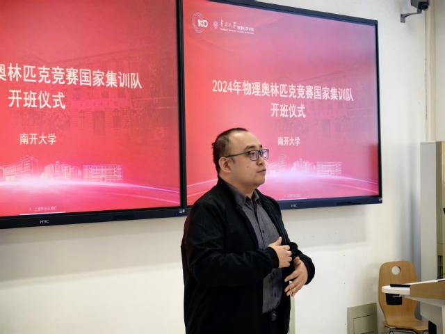 12月1日上午,2024-2025年度物理奥林匹克竞赛国家集训队的开班仪式在南开大学物理科学学院举行。出席开班仪式的人员包括南开大学物理科学学院党委书记唐柏权、物理科学学院副院长李勇男教授、物理科学学院团委书记朱庆磊老师、南开大学招生办公室王梓钰老师以及参训学生等。开班仪式由李勇男教授主持。