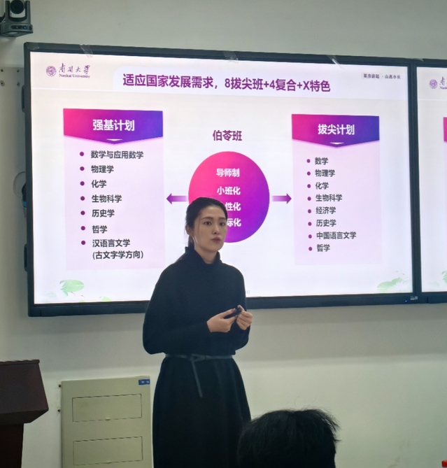南开大学招生办王梓钰老师详细介绍了南开大学本科招生的辉煌成果,特别是近年来在物理学科领域取得的显著成就。王老师通过一系列数据和案例,展示了南开大学在吸引优秀生源、提升教学质量、促进学生全面发展方面的努力和成效,着重介绍了南开大学伯苓班特色招生体系, “选择性+流动性”为本科同学提供多元的发展机会,为在座的学员们描绘了一幅充满希望和机遇的未来图景。