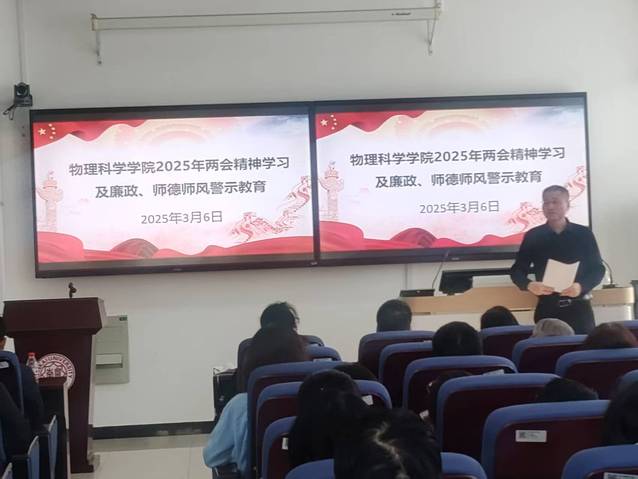 最后,全体教职工共同学习了2025年全国两会精神,纪检委员韩榕副书记进行了师德师风和廉政警示教育,提示全体教职工将“四有好老师”内化于心,关怀指导学生,在教学科研、师德师风、廉政等各方面做好示范榜样,做好学生的引路人,共同为学生成长成才保驾护航。