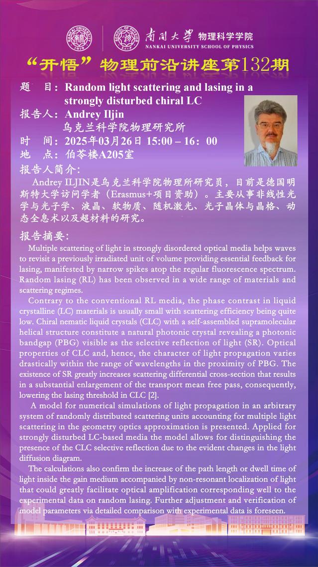 【“开悟”物理前沿讲座 (第132期)】Random light scattering and lasing in a strongly disturbed chiral LC