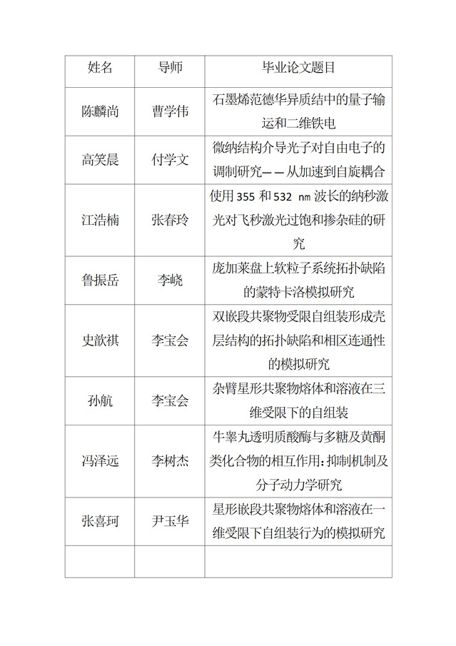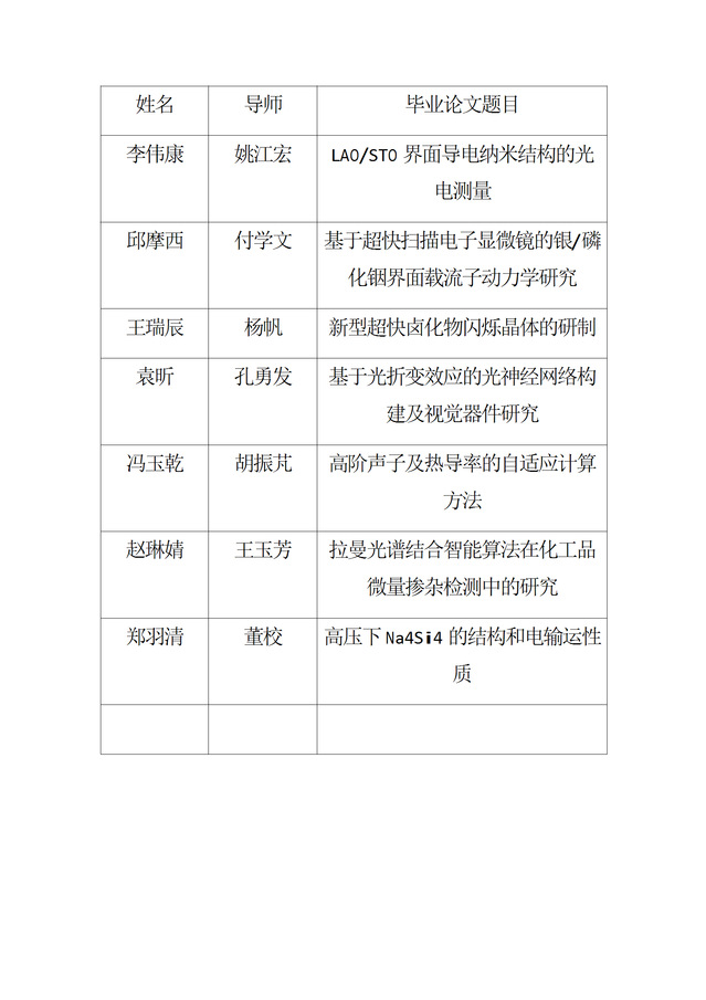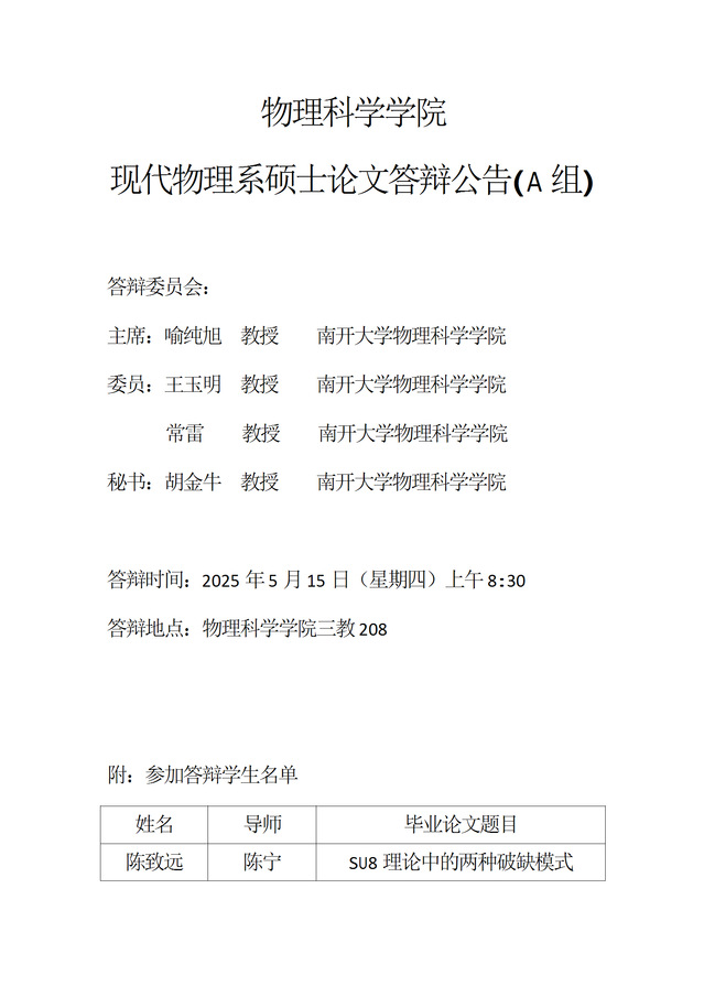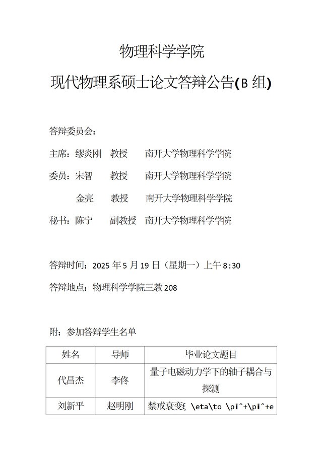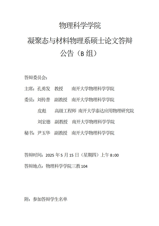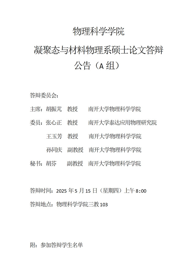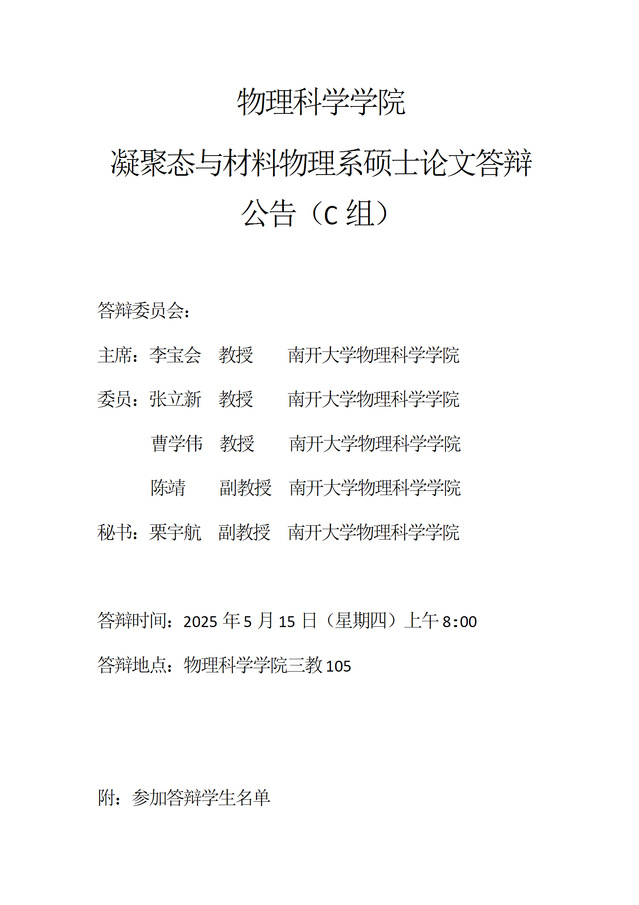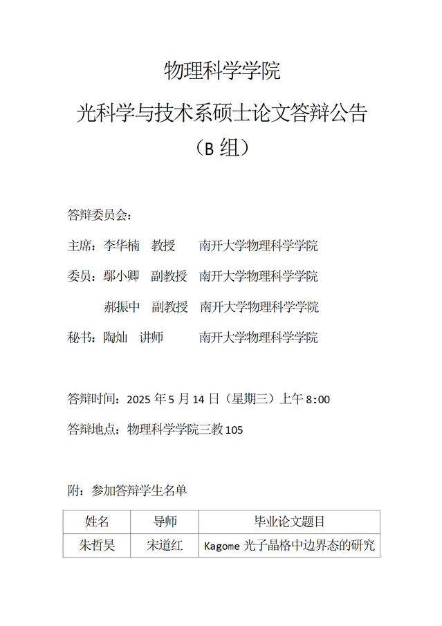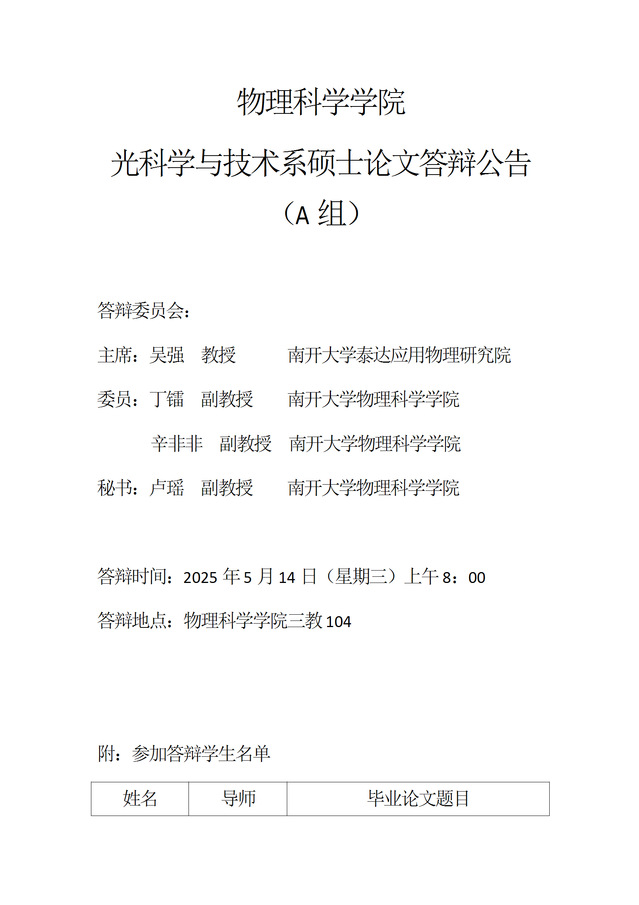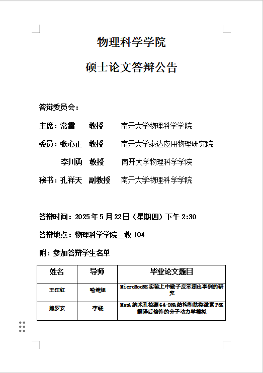 【毕业答辩】2025年春季学期物理科学学院硕士毕业论文答辩公告