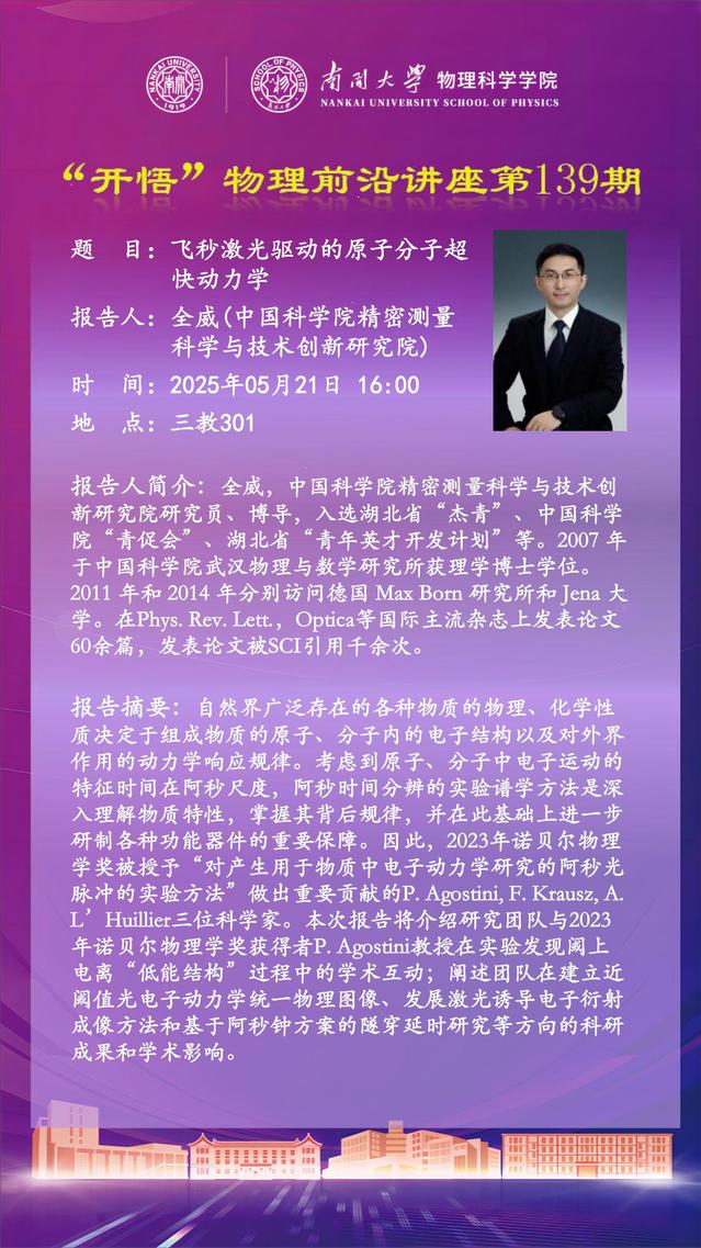 【“开悟”物理前沿讲座 (第139期)】飞秒激光驱动的原子分子超快动力学
