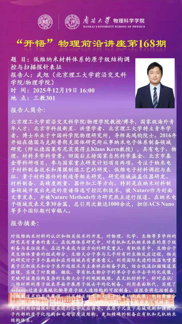 【“开悟” 物理前沿讲座 (第168期)】低维纳米材料体系的原子级结构调控与扫描探针表征