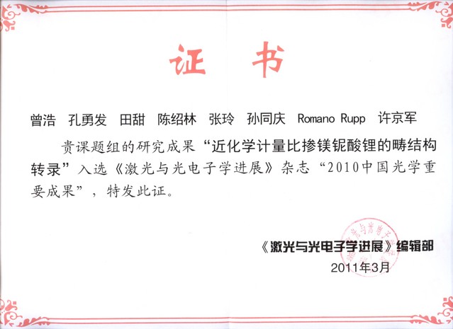 (3)提出铁电畴结构的转录技术,被《激光与光电子学进展》杂志评为“2010年中国光学重要成果”。