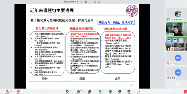In the morning session of the conference, 8 keynote presentations were arranged to share the prominent achievements and the latest results of the school in the aspects of courses of ideology and politics, academic achievements and experimental teaching. Cai Wei, Zhang Xinzheng, Dong Xiao and Fu Xuewen reported their cutting-edge achievements respectively under the topics of Research on Near Field Imaging and Application of Mid-Infrared Graphene Plasmons, Topological Control of Terahertz Waves in Nonlinear Photon Chips, Law of Elements Under High Pressure, Development and Preliminary Application of the New Generation of 4D Ultrafast Transmission Electron Microscope Based on Field Emission Electron Gun. Centered around the theme of New Understanding and New Practice of Courses of Ideology and Politics, Liu Yubin shared practical experience and ideas of courses of ideology and politics combining with specific cases. Zhang Siyao delivered a lecture with the title of Sound Speed Measurement as an example teaching. Wu Yuanbin and Chen Xudong, new enrolled teachers of the school, introduced the latest research trends respectively on behalf of the youth force.